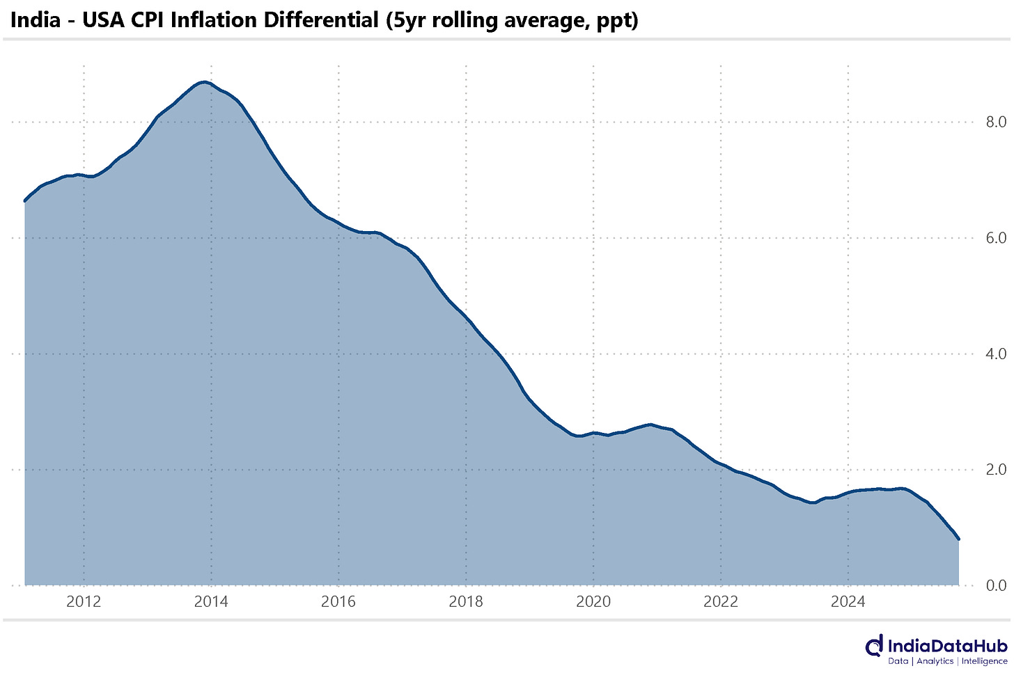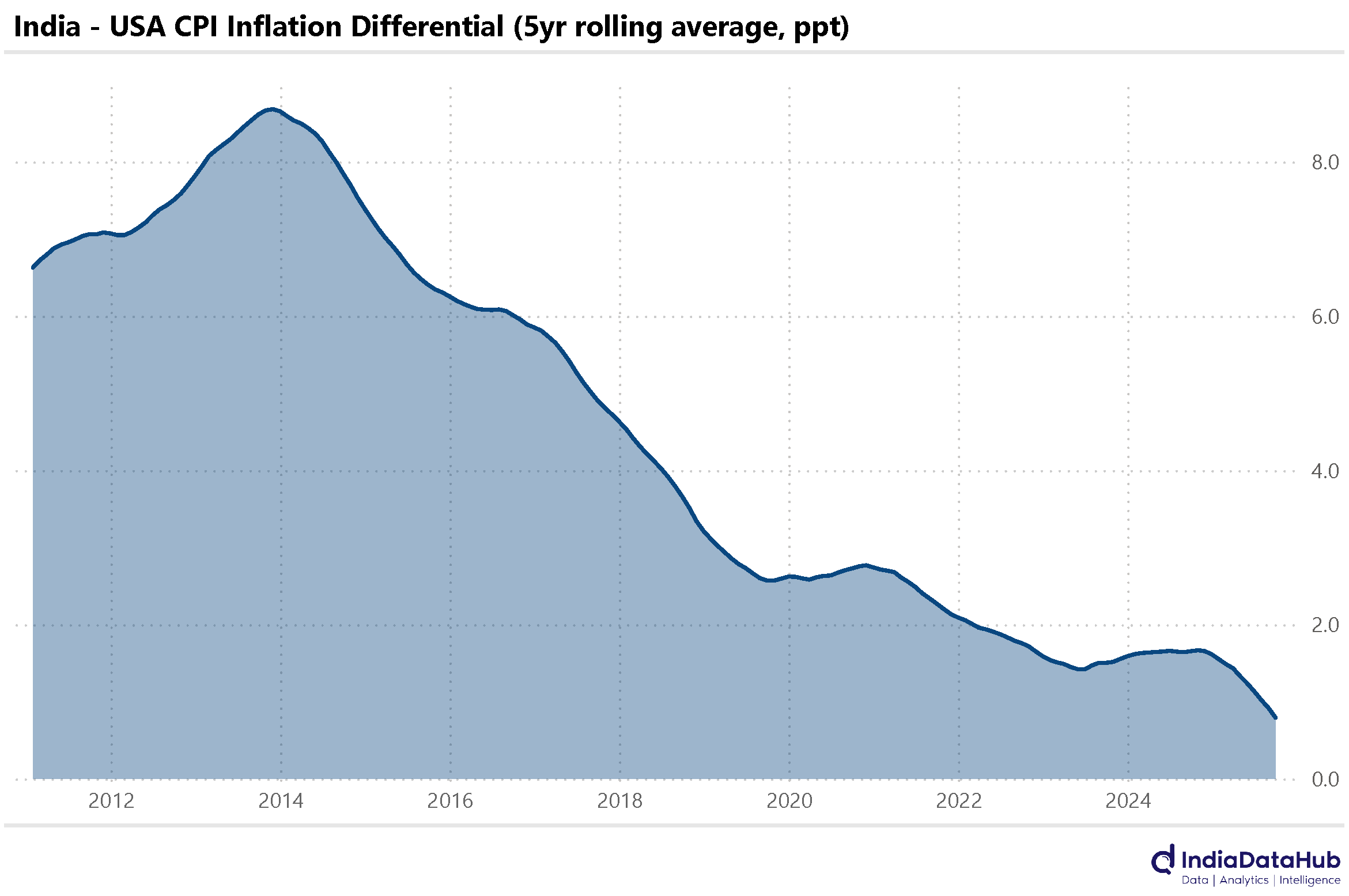 India’s inflation is now lower than that in the US. October will be the 5th consecutive month that the CPI Inflation in India will be lower than that in the USA. And while Inflation in India being lower is probably an exception, structurally inflation differentials seem to have moderated in the last few years. In the long run, it is the inflation differential that drives relative exchange rate movements, and thus if inflation differentials remain low, if not negative, this will be the biggest structural support for the INR against the USD. If inflation differentials remain low, that is…