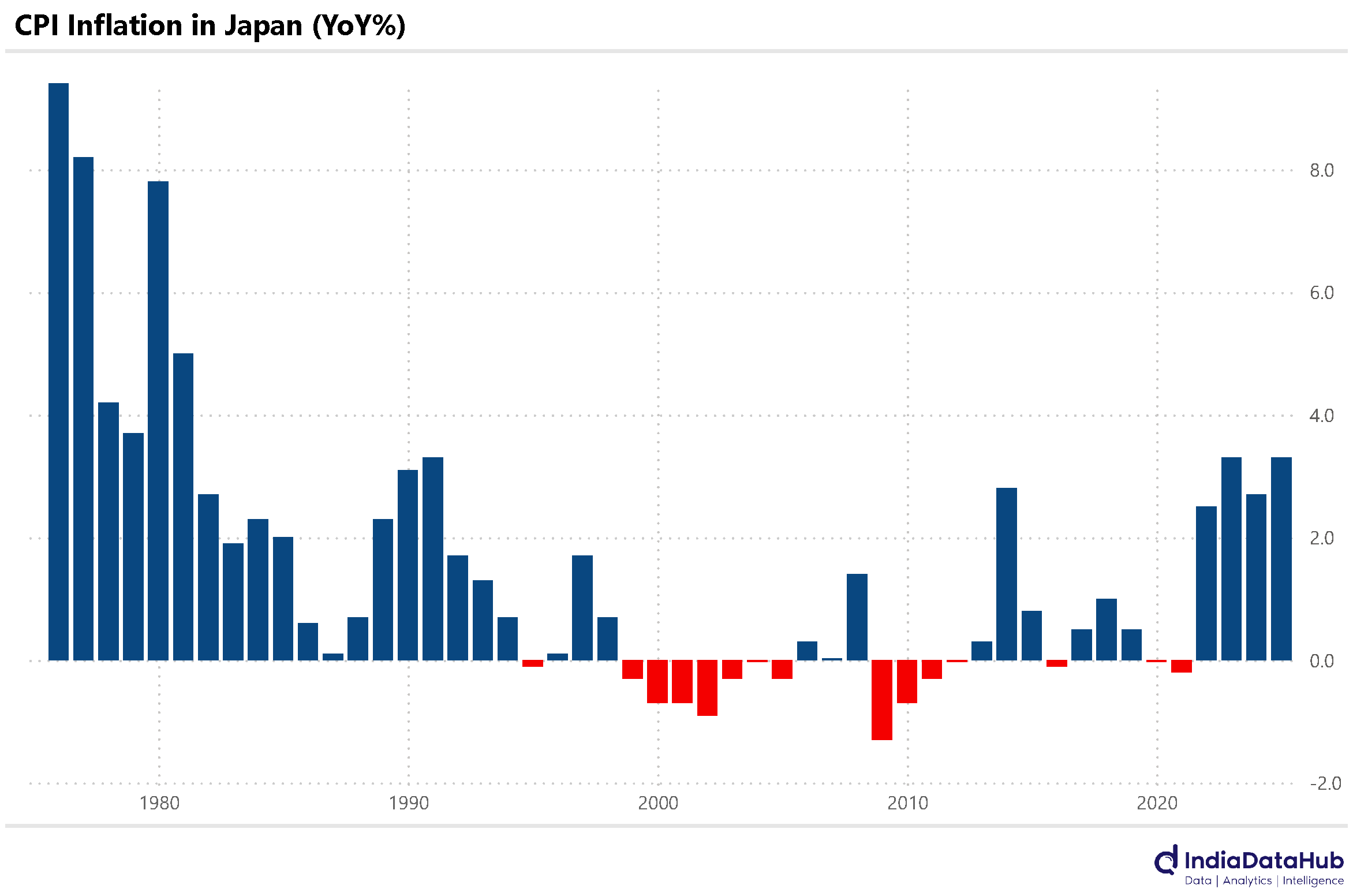 CPI Inflation has averaged 3.3% YoY so far in 2025 (till Oct). Calendar year 2023 had similarly seen inflation average 3.3%. But before that, the last time inflation had averaged 3% or higher in Japan was in the year 1991! Between 1992 and 2021, a period of 30 years, the average annual inflation was 0.3% with 15 of those years seeing negative CPI!