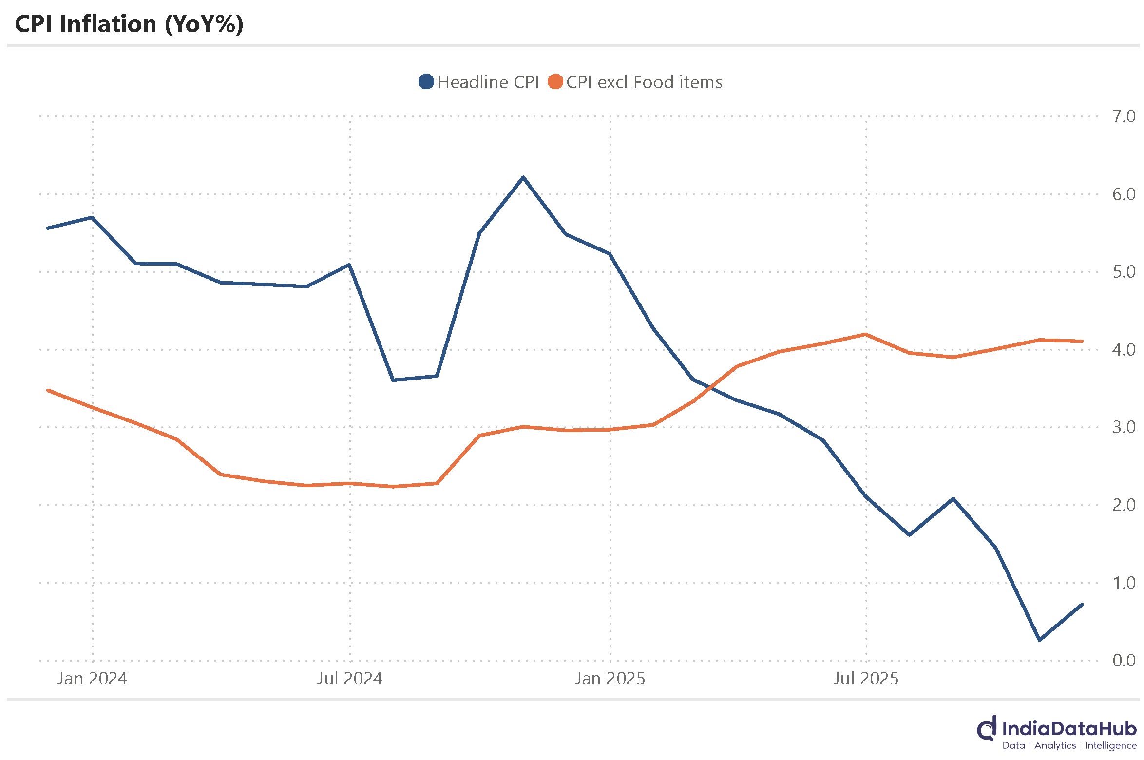 Another month and another low reading on Inflation. CPI Inflation printed at 0.7% YoY in November, up slightly from the 0.3% YoY print in October but well below the RBI’s target of 4%. In fact, CPI is now running even below the lower bound of the CPI target of 2% set for the RBI’s MPC. This quarter is likely to be the second quarter in a row that CPI inflation will average below 2%.