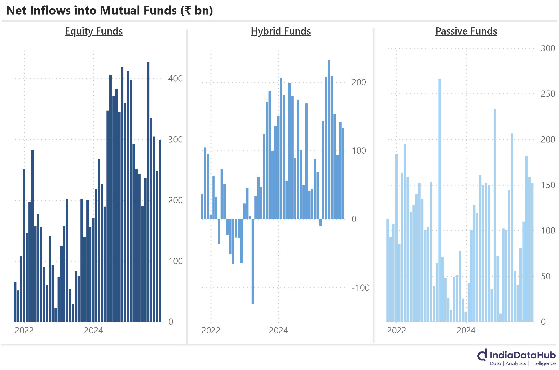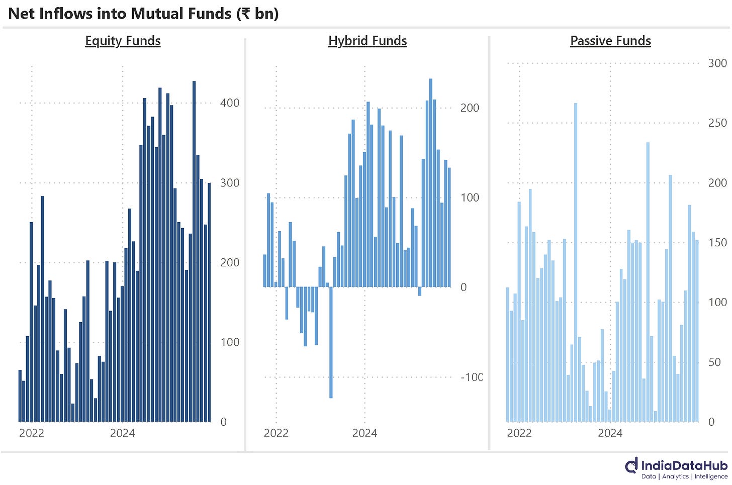 November was another strong month for flows into domestic equity funds. Net inflows totalled ₹300bn, higher than the net inflows of ₹250bn in October. Hybrid funds also saw strong inflows of over ₹130bn in November, although the pace has moderated a bit in recent months. And passive funds have also seen strong inflows in the last few months. November saw net inflows of ₹152bn, among the highest monthly inflows in recent years.