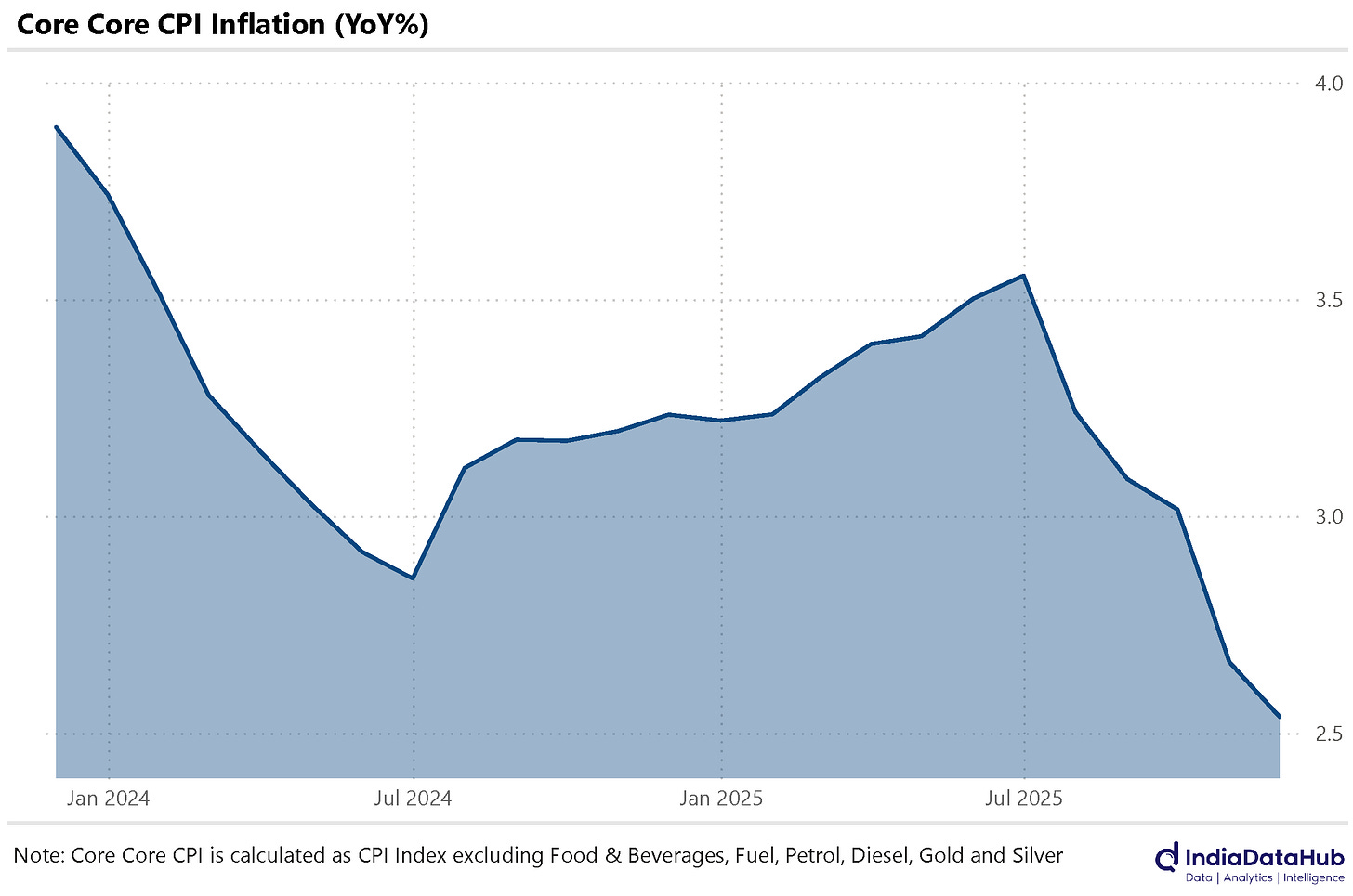 Extremely benign food inflation continues to be the key driver of lower headline inflation. CPI excluding food and beverages has remained stable, averaging around 4% since April this year. But even here, there are non-core factors. Gold prices, which have risen sharply in the last few months, have been an important upward driver of non-food inflation. Accordingly, the core-core inflation that takes out food, energy, fuel and precious metals has fallen sharply – 2.5% YoY in November, the lowest in recent times.