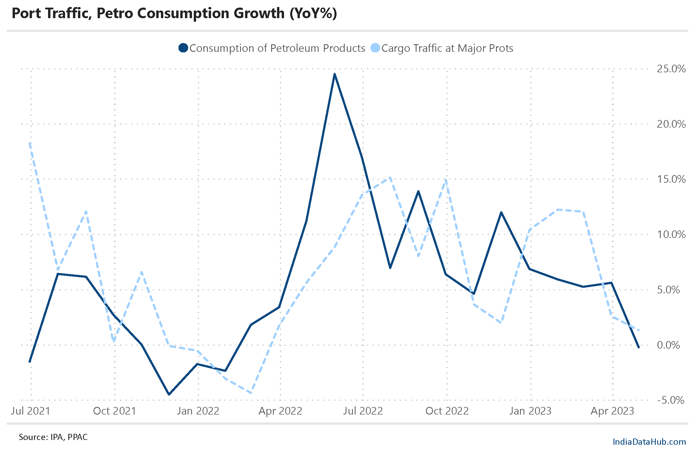 Similarly, consumption of all petroleum products declined modestly in April, the first monthly decline since January last year. While diesel consumption grew at a strong 9% YoY, petrol consumption grew just 3% YoY and LPG consumption has been declining for 4 months in a row now. The growth in diesel consumption likely reflects the shift in traffic away from railways – railway freight traffic has been growing in the low single digits for the past few months.