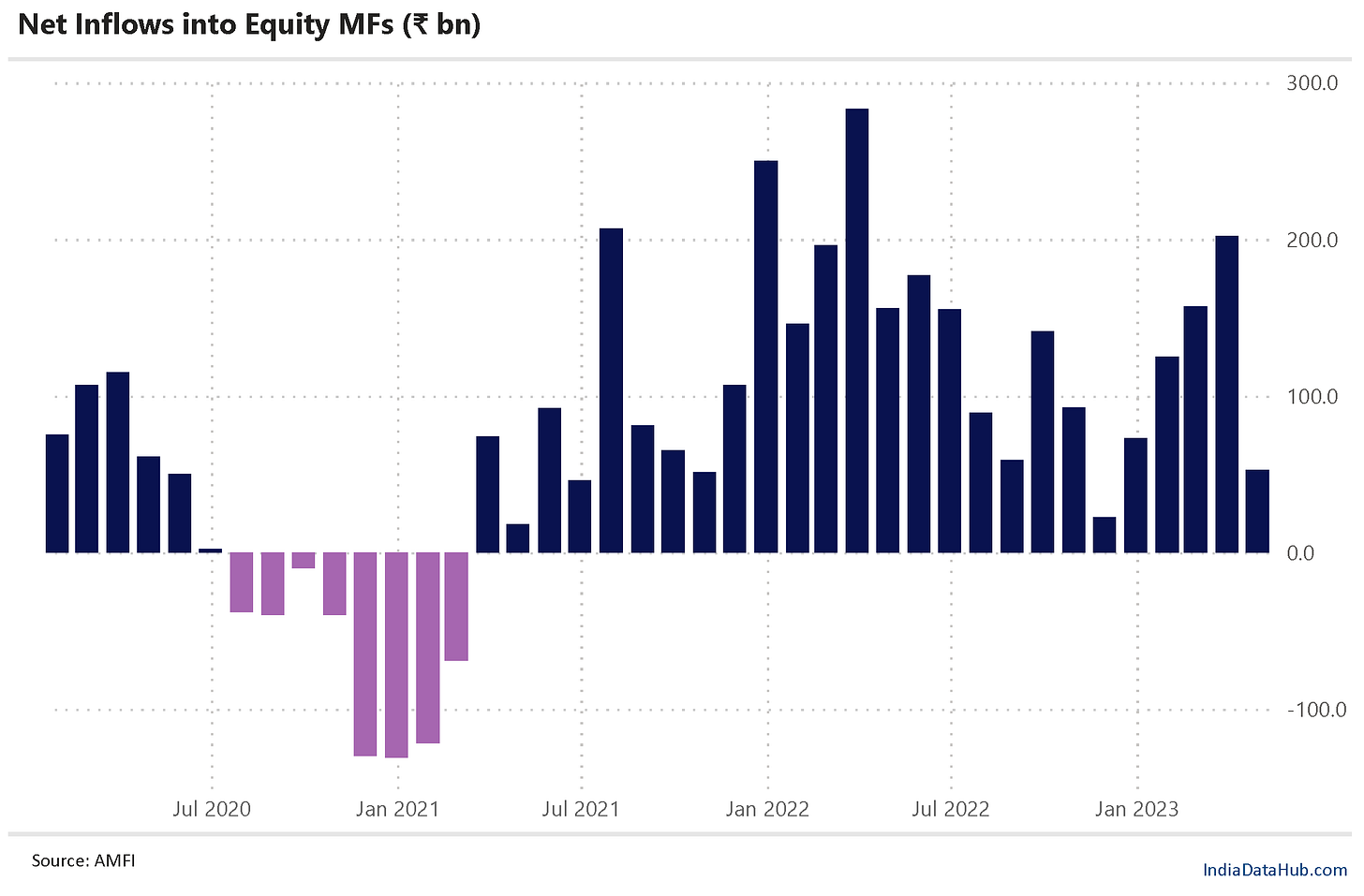 Domestic mutual funds continue to attract inflows, though the pace moderated in April. Equity funds attracted net inflows of just over ₹50bn in April. This is less than half of the average inflows in the preceding 3 months. What is impressive though is that April was the 26th straight month of net inflows into equity funds. Hybrid funds also saw inflows in April after seeing large outflows in March. The big picture here though is that hybrid funds have seen practically zero net inflows in the past 18 months.