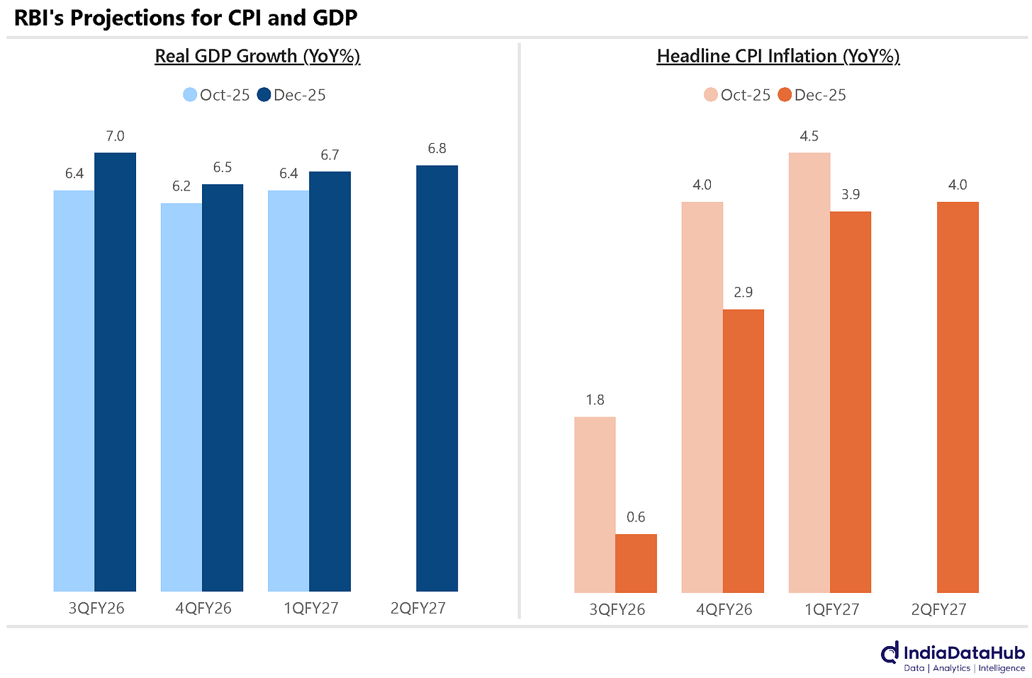 What has driven the rate cut is lower inflation. Inflation has continued to surprise on the downside, leading the RBI to reduce its inflation forecast pretty much across the board. For instance, the RBI has reduced its inflation forecast for the June quarter next year from 4.5% in the October policy to 3.9% in this policy. So lower inflation for longer. And at the same time, growth remains reasonably strong. While the RBI does not expect 8% growth in 2Q to sustain, it has increased the growth forecast for say the June quarter next year from 6.4% in the October policy to 6.7% currently.