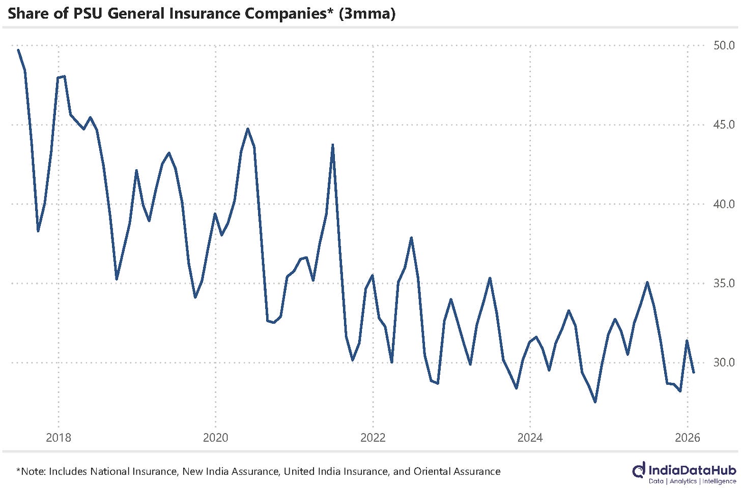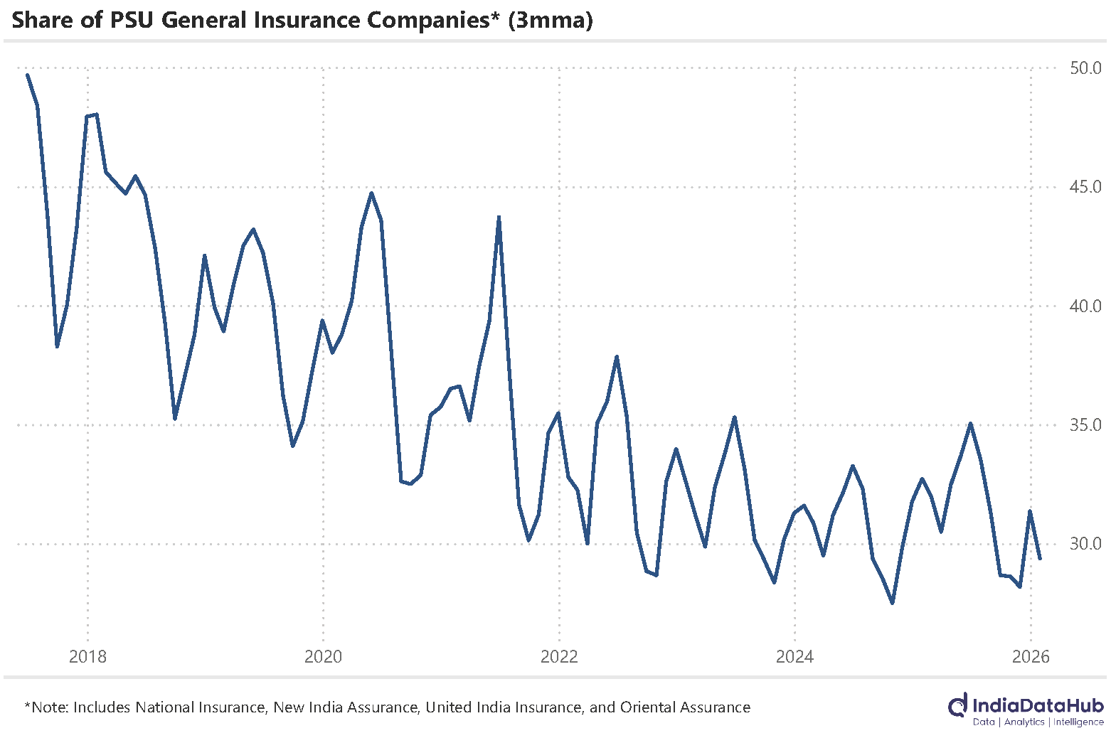 Among the larger companies, Bajaj, HDFC, Kotak, and SBI have seen a sharp pick up in growth. The erstwhile public sector general insurance companies continue to lose market share. Their market share has fallen from close to 50% in mid-2017 to less than 30% currently.