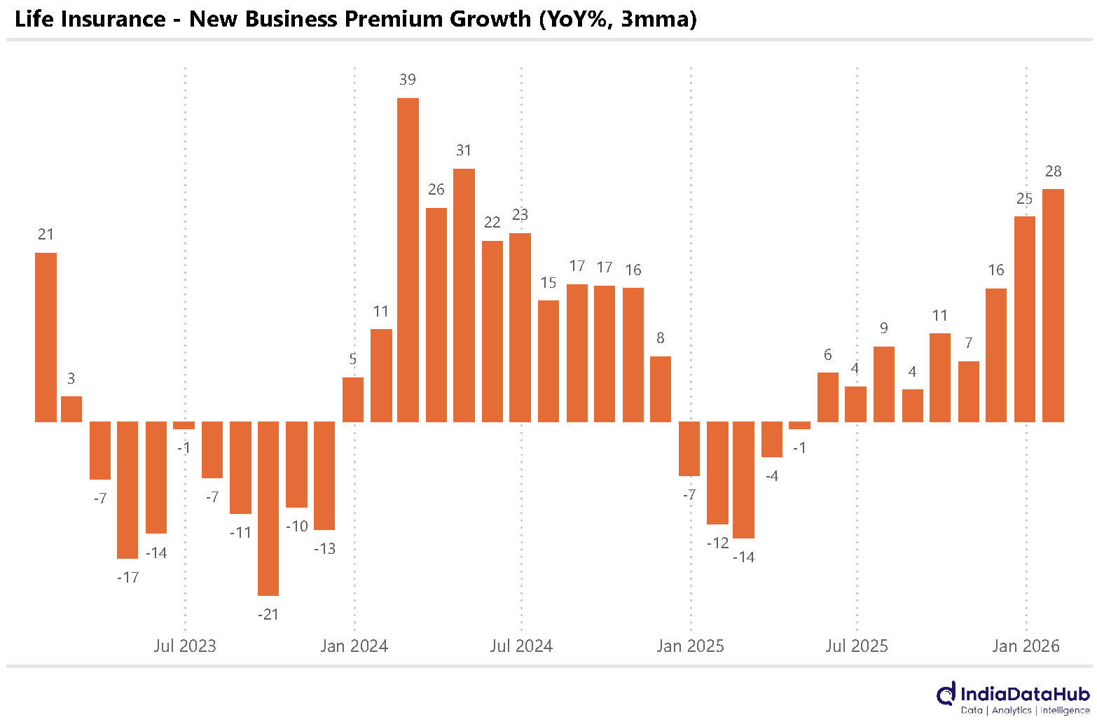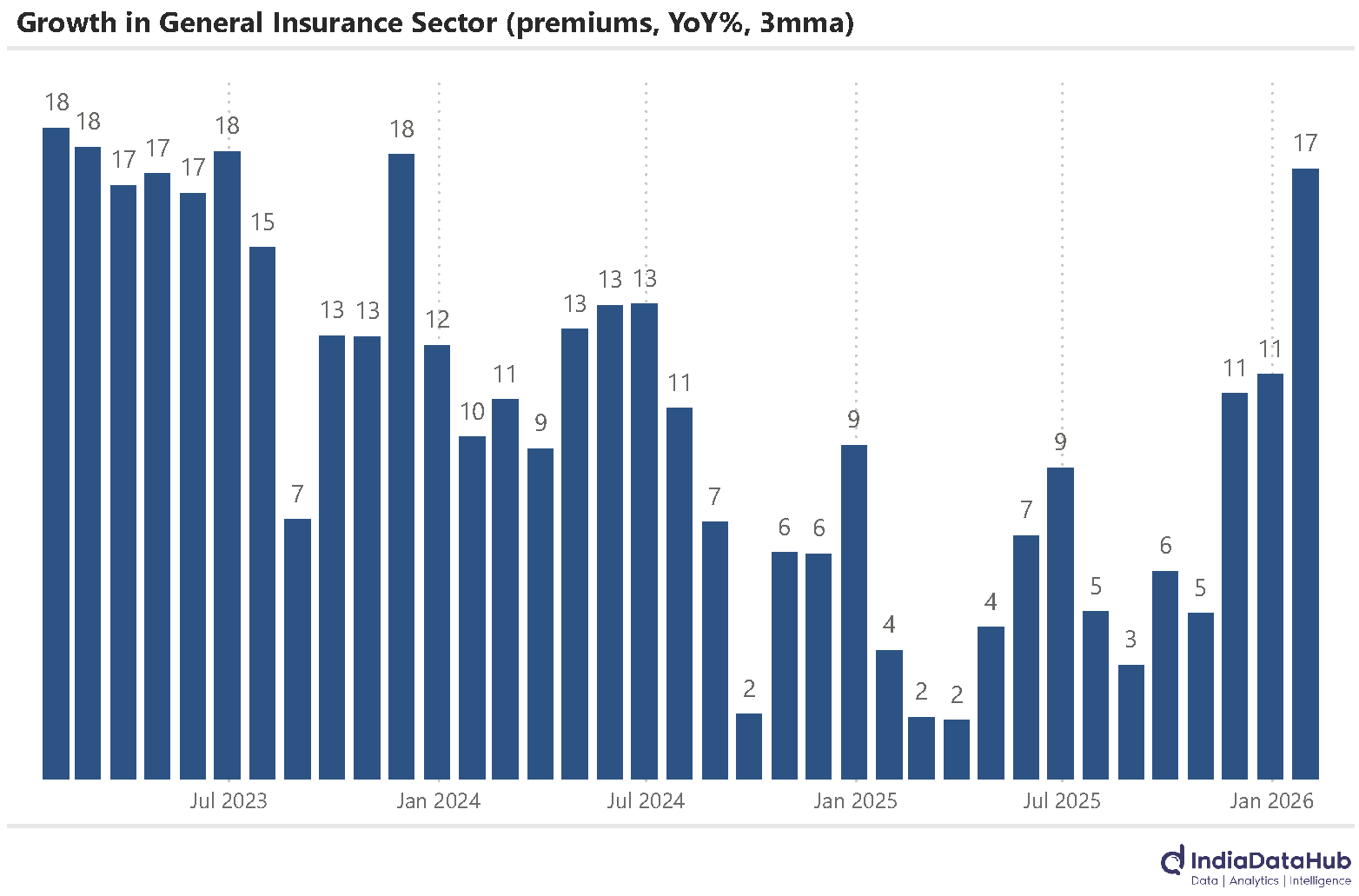 The general insurance sector is also seeing a pick-up in growth. Over the past three months, the total business of the general insurance companies has grown by 17% YoY, the strongest growth in over 2 years.
