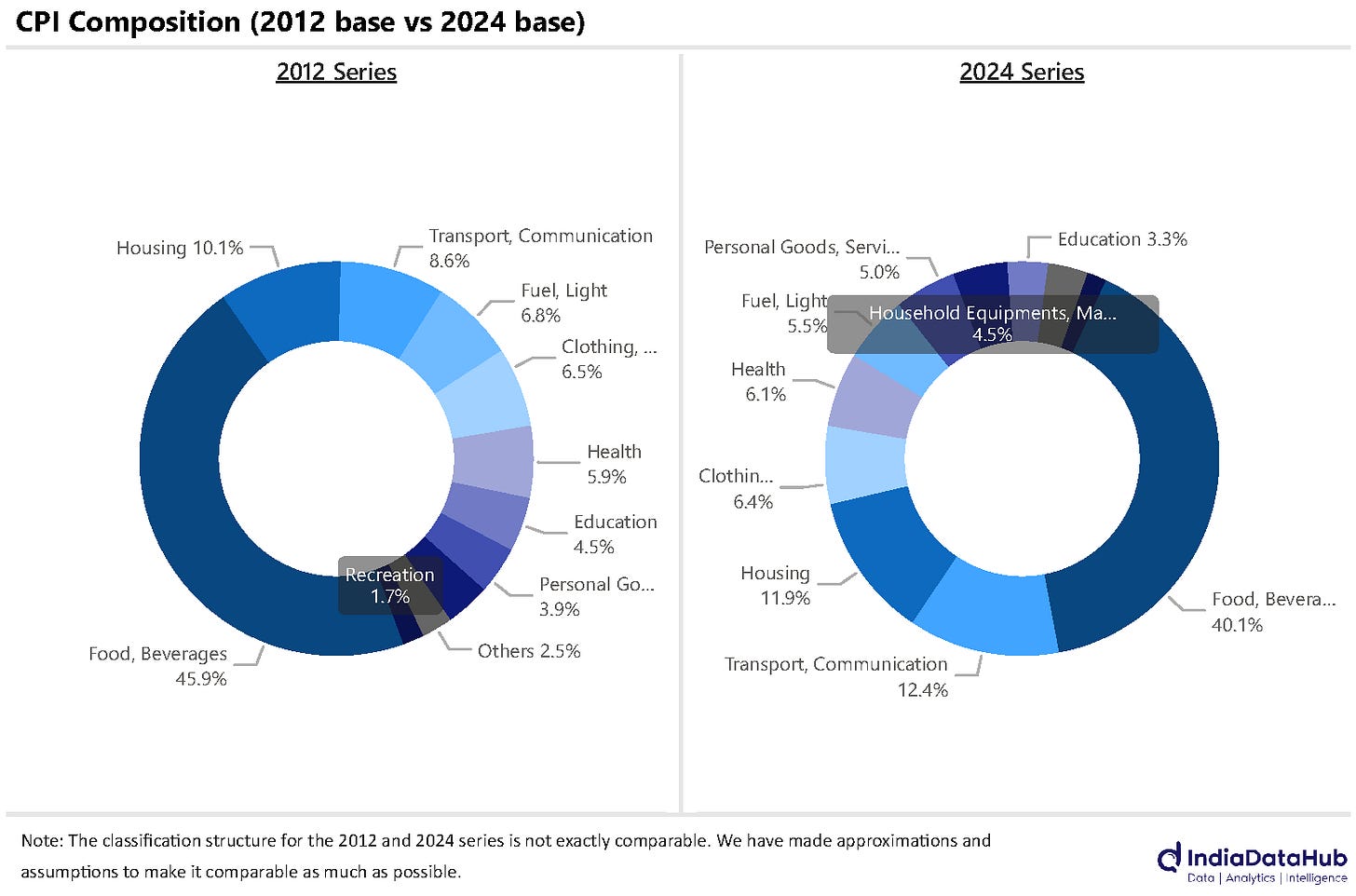 One of the key changes in the new series is the lower weight for food relative to the earlier series. Given that food is the most volatile component of the CPI, this lower weight will make the CPI series less volatile. There are, of course, several under-the-hood changes in terms of a more representative basket of commodities, a larger number of commodities, more markets from which price data is collected, and so on, which should improve its credibility.