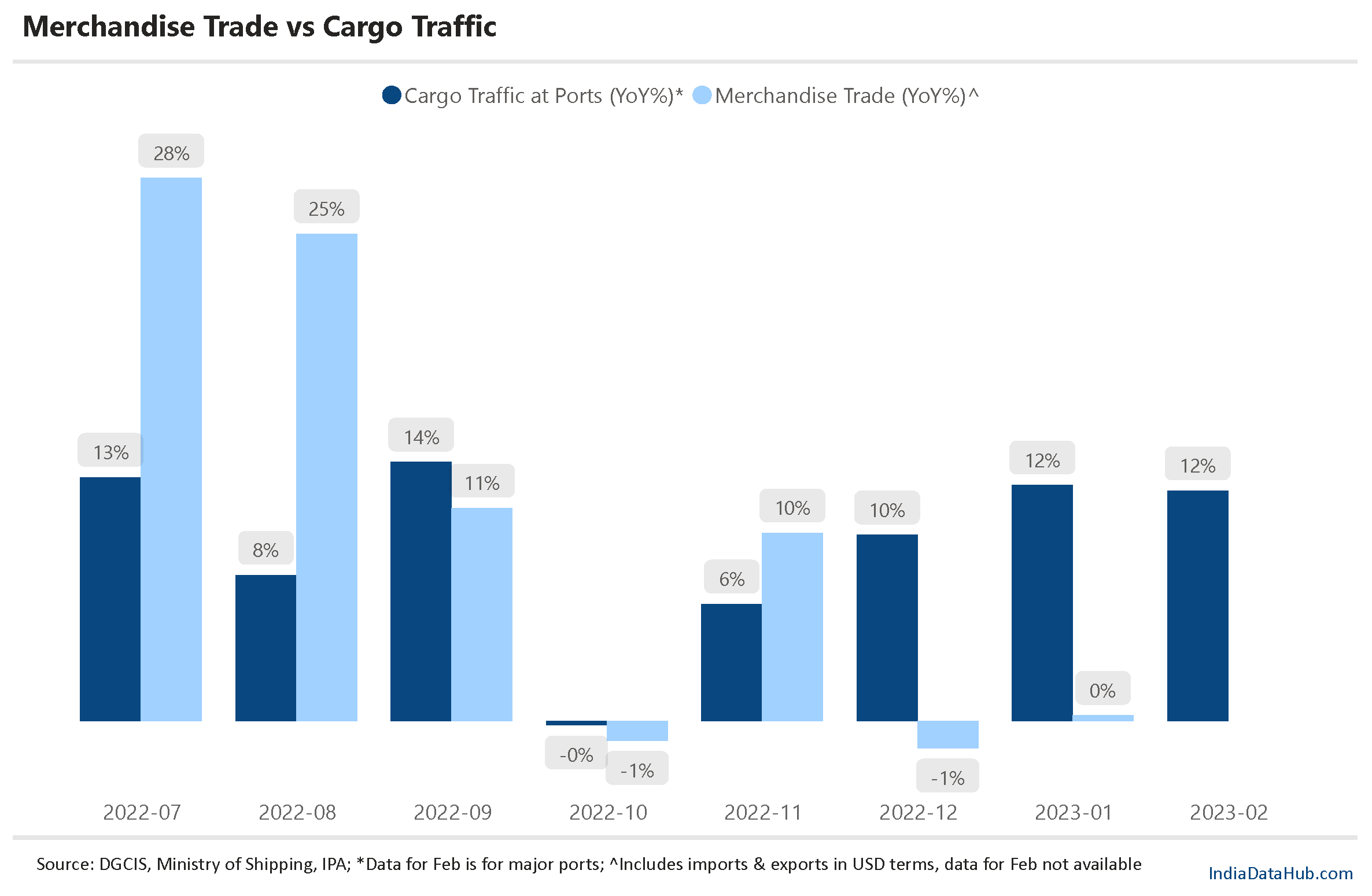 Another interesting trend in the data is the divergence between value and volume in external trade. In December and January, merchandise trade grew 0% in value (USD terms). However, cargo traffic at ports grew by double digits. And in provisional data released this week, cargo traffic at major ports (~50% of total cargo handled), grew in double digits in February as well. Effectively, foreign trade is continuing to see strong growth in volume terms even as in value terms growth has come to a standstill. This underscores the point made above regarding lower inflation dragging down credit growth – both bank credit and merchandise trade are nominal indicators. Cargo traffic is a real or volume metric. In times like this when commodity prices rose rapidly and are now cooling, volume indicators offer a better read on the economy than value indicators.