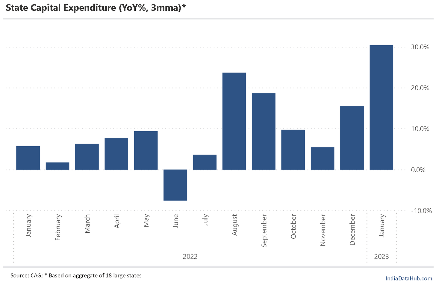 This trend continued in the first few months of the year. But in the last three months, this has changed. Based on the aggregate data of the 18 large states, aggregate capital expenditure has increased by 30% YoY in the last 3 months as against just 5% growth between April – October. As we explained in our monthly report Fiscal Matters, state governments have generally seen stronger revenue buoyancy than the Central government in the past few quarters since they rely more on ad-valorem taxes. However, they have used this buoyancy for fiscal consolidation rather than on capex. However, if revenue buoyancy continues then as we head into the election-heavy next few quarters, this momentum behind state capex is likely to continue. This will be a big fillip to the domestic investment cycle if this materialises.