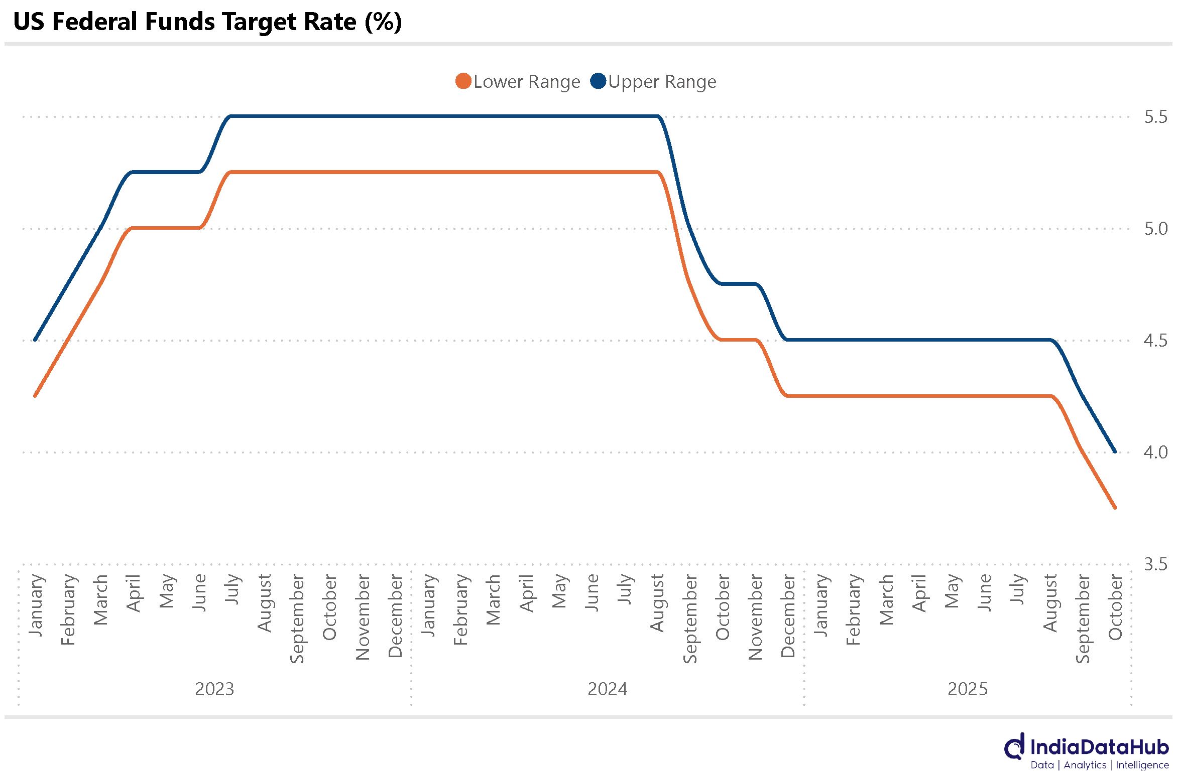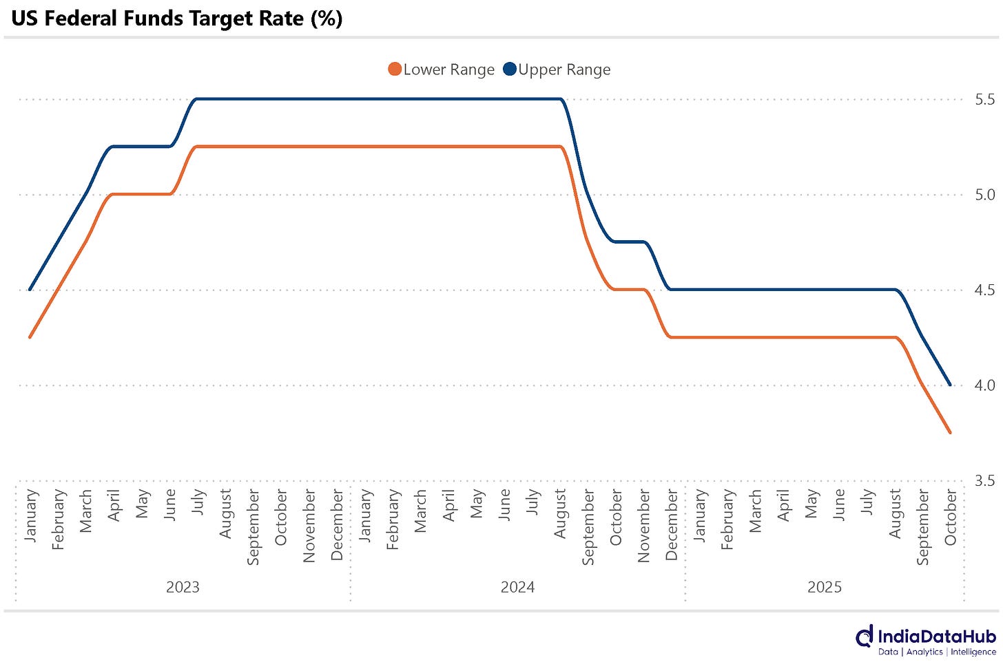 Globally, this week was a busy week, with several key updates from central banks and fresh data on inflation and growth. Starting with central banks, the U.S. Federal Reserve lowered its key policy rate by 25 basis points to a target range of 3.75%–4.00%. The decision reflects slower job growth even as inflation has seen an uptick. Fed Fund futures are signally another rate cut in December followed by a pause in the first quarter of 2026.