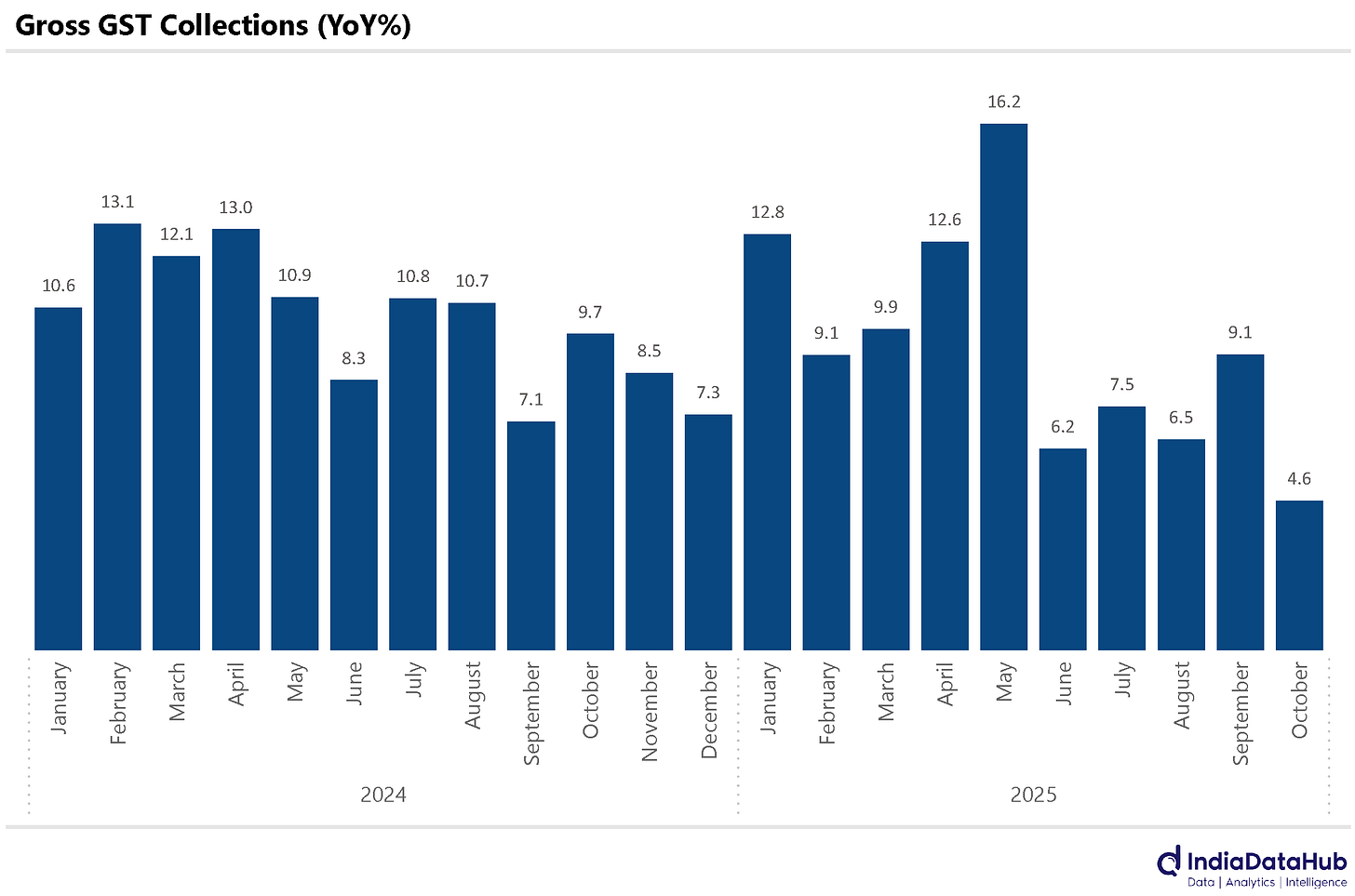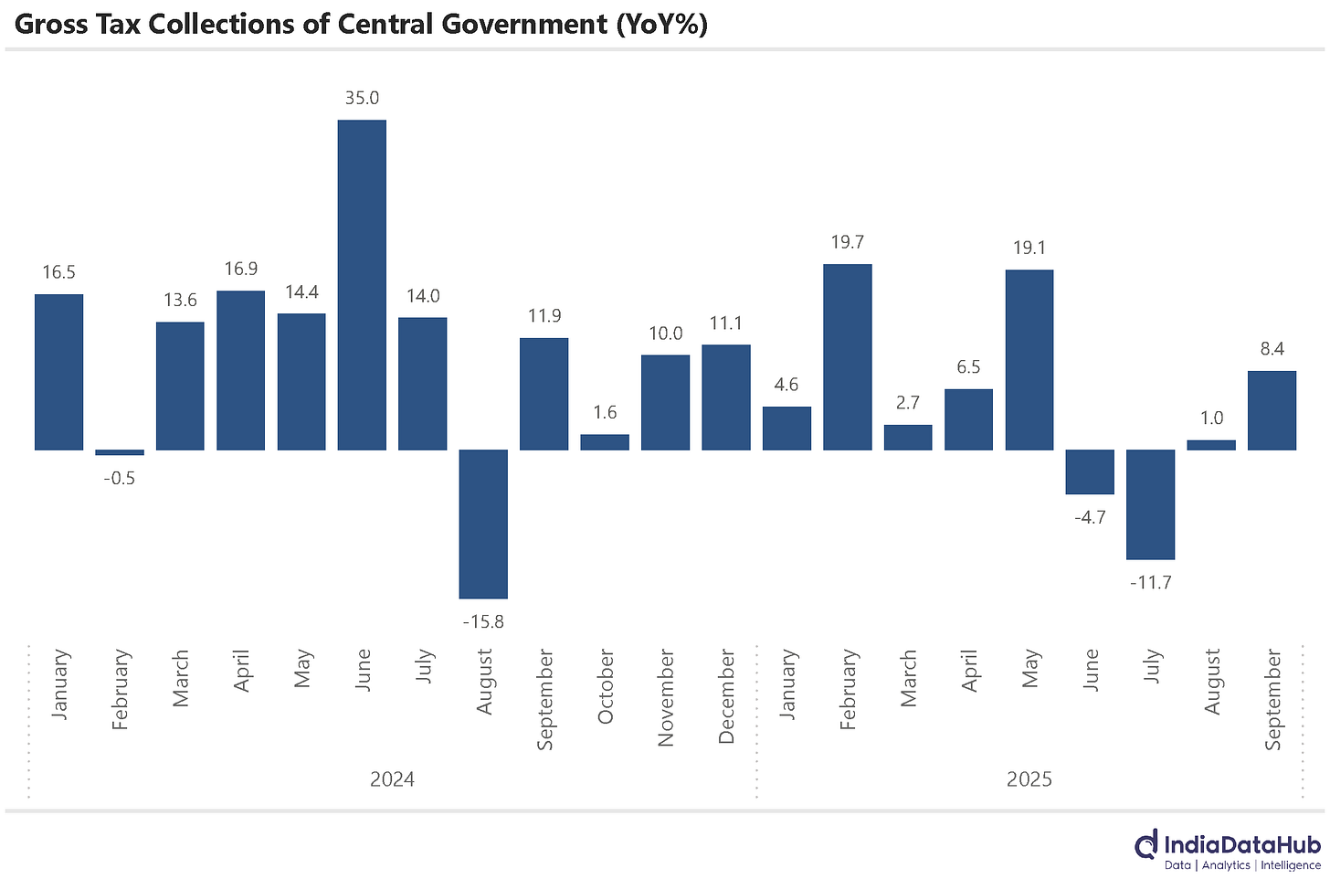 September was a reasonable month for tax collections. Overall, the central government’s gross tax collections grew by 8% YoY, the fastest growth since April-May this year.