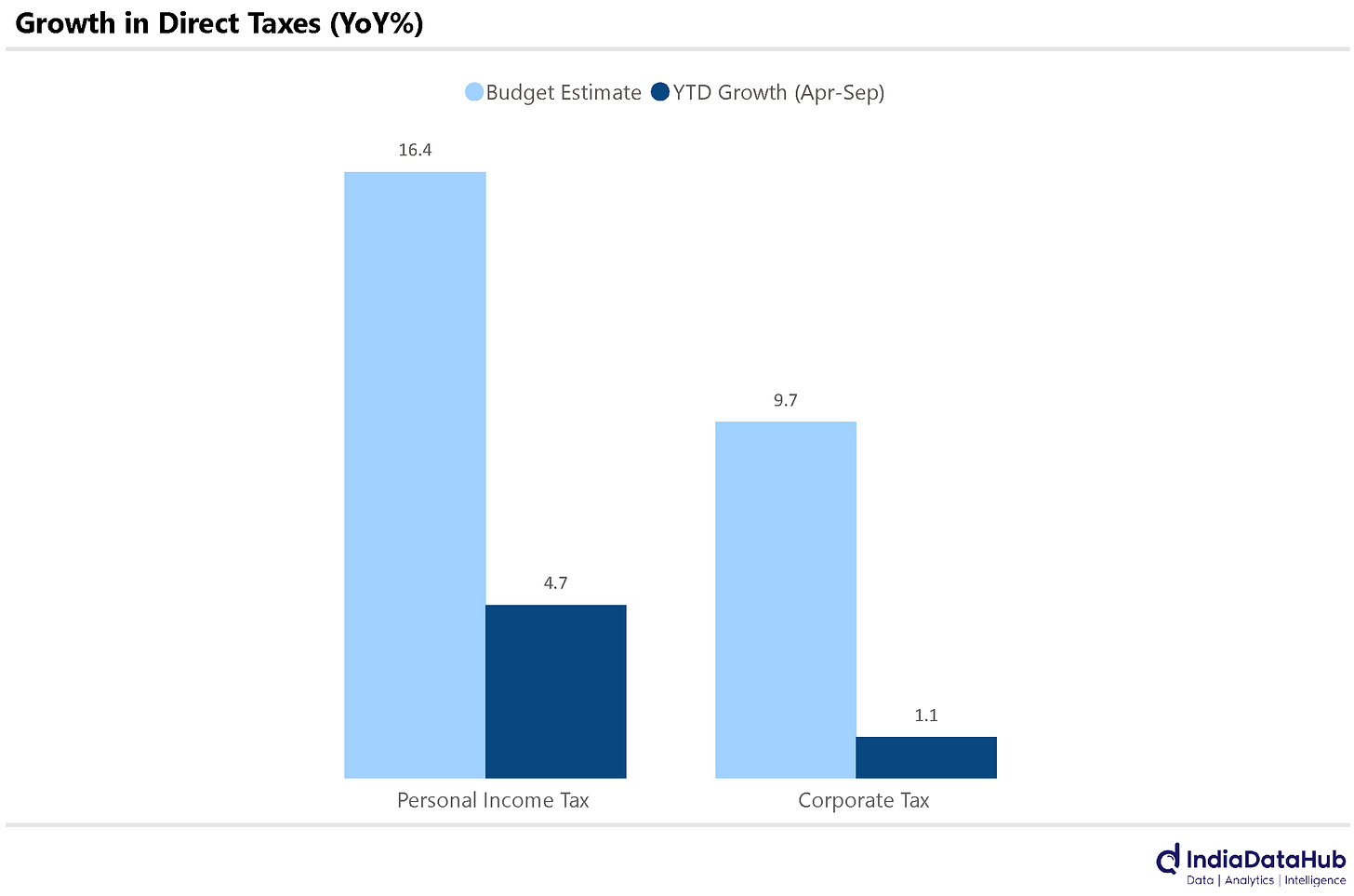 Personal income tax collections grew by over 30% YoY in September. This, though, largely reflects the shift in the date for filing tax returns for individuals from July to September. What is thus important to note is that the YTD personal income tax collections growth is a modest 5% YoY. Thus, direct taxes, which account for over 55% of total tax collections, are seeing low single-digit growth in tax collections as against double-digit growth estimated in the budget.