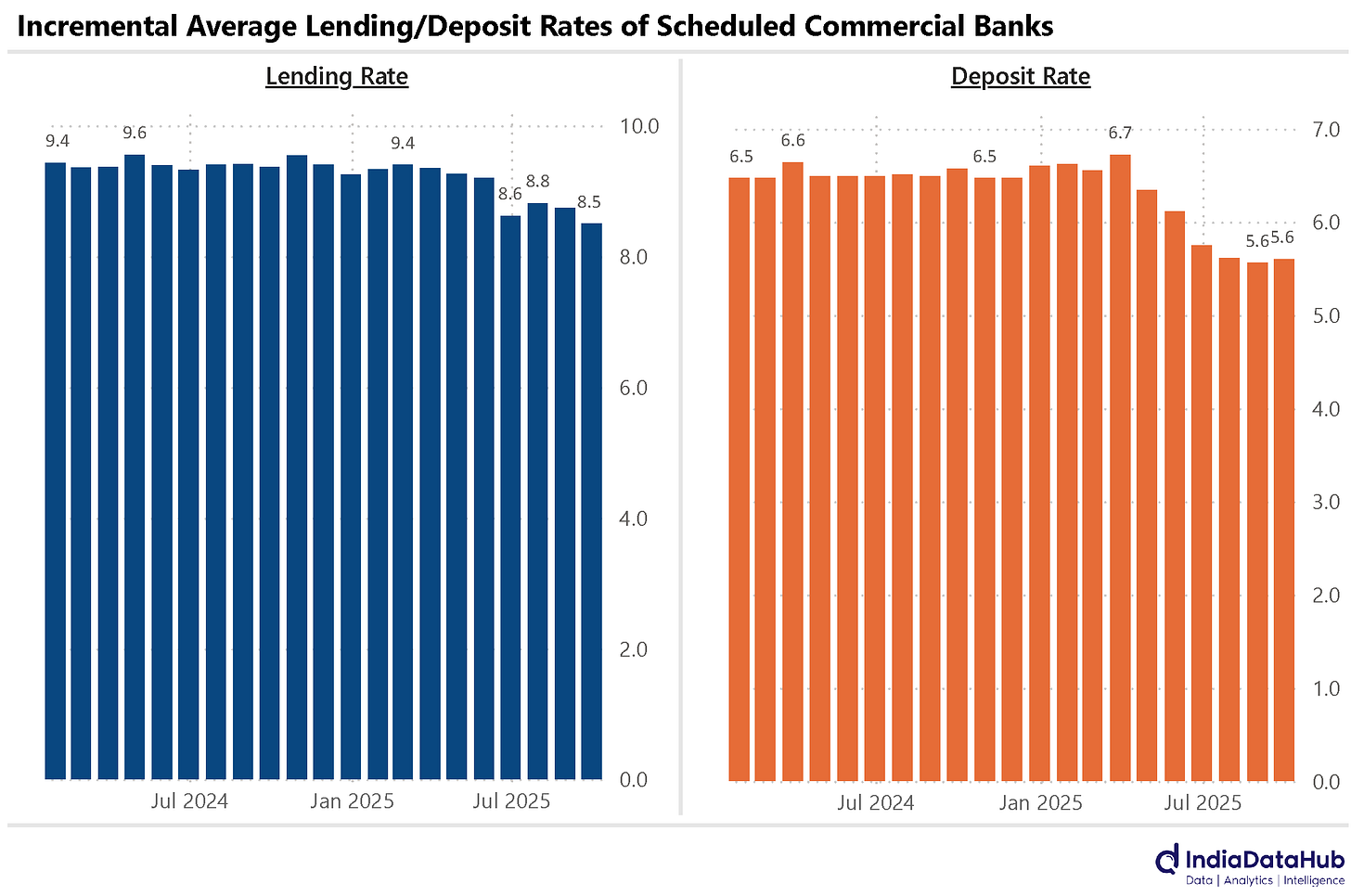 Monetary transmission has gathered pace in recent months. September saw a 25bps decline in the weighted average lending rate on fresh loans by the Scheduled Commercial Banks. Over the past year, the weighted average interest rate on fresh loans has declined by ~100bps, in sync with the reduction in the policy repo rate. Incremental average deposit rates have similarly seen a ~90bps decline over the past year, which is also in sync with the decline in the policy repo rate.