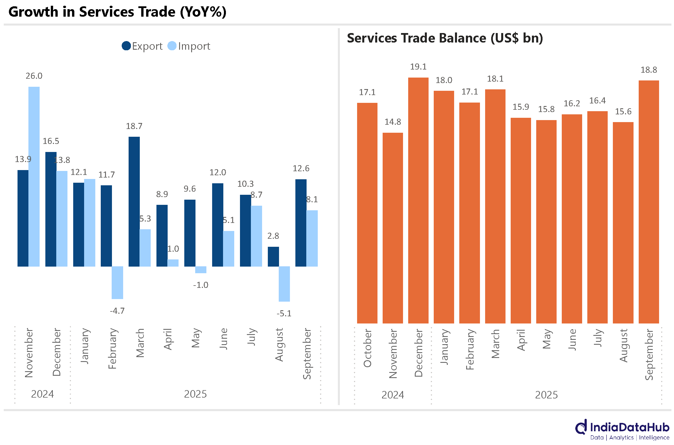 After a blip in August, services trade recovered in September. Exports grew by 12.6% YoY, as against a modest 3% growth in August. Imports similarly grew by 8% YoY, as against a 5% decline in August. The faster growth in exports relative to imports meant that the services trade surplus grew by 17% to just under US$19bn, and the second highest on record.